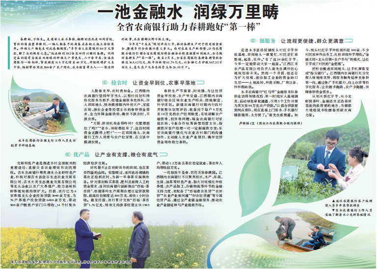 春耕始,万物生。走进安义县石鼻镇,翻耕的农机在田间穿梭,育秧的苗盘整齐排列,一幅人勤春早的画卷正在红土地上徐徐展开。种粮大户杨先生对此感触颇深:“多亏安义农商银行50万元贷款,解了我的燃眉之急。”他流转的332亩农田得以顺利备耕。同样受益的还有金溪县双塘镇的种粮大户黄先生,二十余年来,金溪农商银行一路相伴,贷款额度从5万元增至40万元,种植规模扩大至千亩,辐射带动周边300余户农户增收,成为致富带头人……像这样的故事,正在赣鄱沃野不断上演。