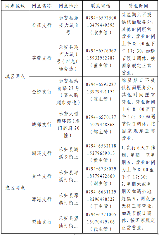 为合理运用服务资源,提升我行“服务暖行”质效,自2026年4月11日起,乐安农商银行部分网点实行周六、周日弹性工作制,现就有关事项公告如下,敬请广大客户相互告知。