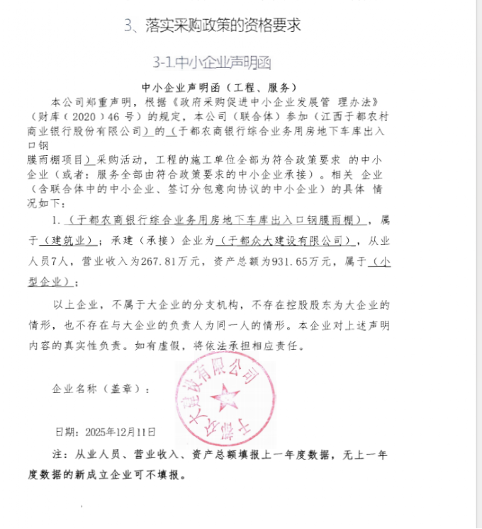 负责于都农商银行综合业务用房地下车库出入口钢膜雨棚项目,详见采购文件 |